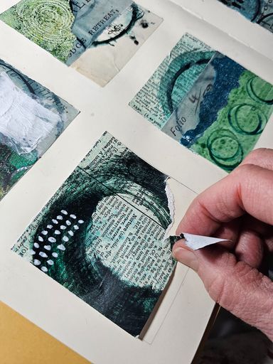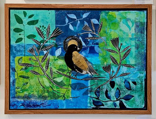 Much of my work begins on the Gelli plate, where I create hand-printed papers using stencils, stamps, and intuitive mark-making. These textured papers become the foundation for collage and painting. I’m drawn to the unpredictability of the process—each print reveals something unexpected, and intuition guides the composition as the work evolves.